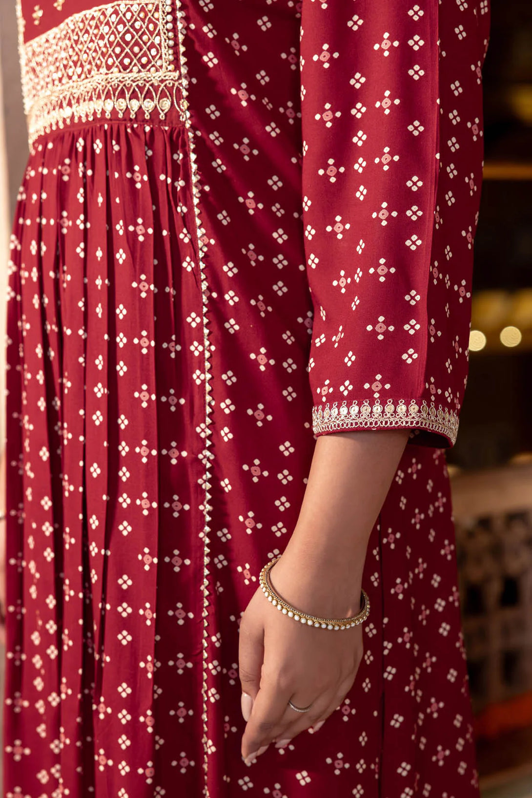 - Solid square yoke highlighted with delicate beads and sequin work on the yoke along with gota patti.